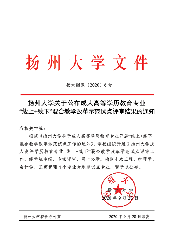 扬州大学关于公布成人高等学历教育专业“线上+线下”混合教学改革示范试点评审结果的通知