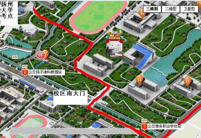 江苏省成人高校招生旅游管理、烹饪专业加试工作在扬州大学扬子津西校区7号楼(MPA中心)进行,从扬州市汽车西站乘16路、39路公共汽车在“商务职业学校”站口下车,可到达该扬州大学扬子津校区南门(华扬西路196号),考生统一由校区南门进入(由于城市道路改造,邗江中路上的校区东门封闭)。