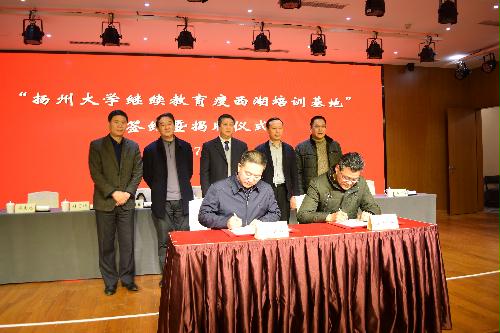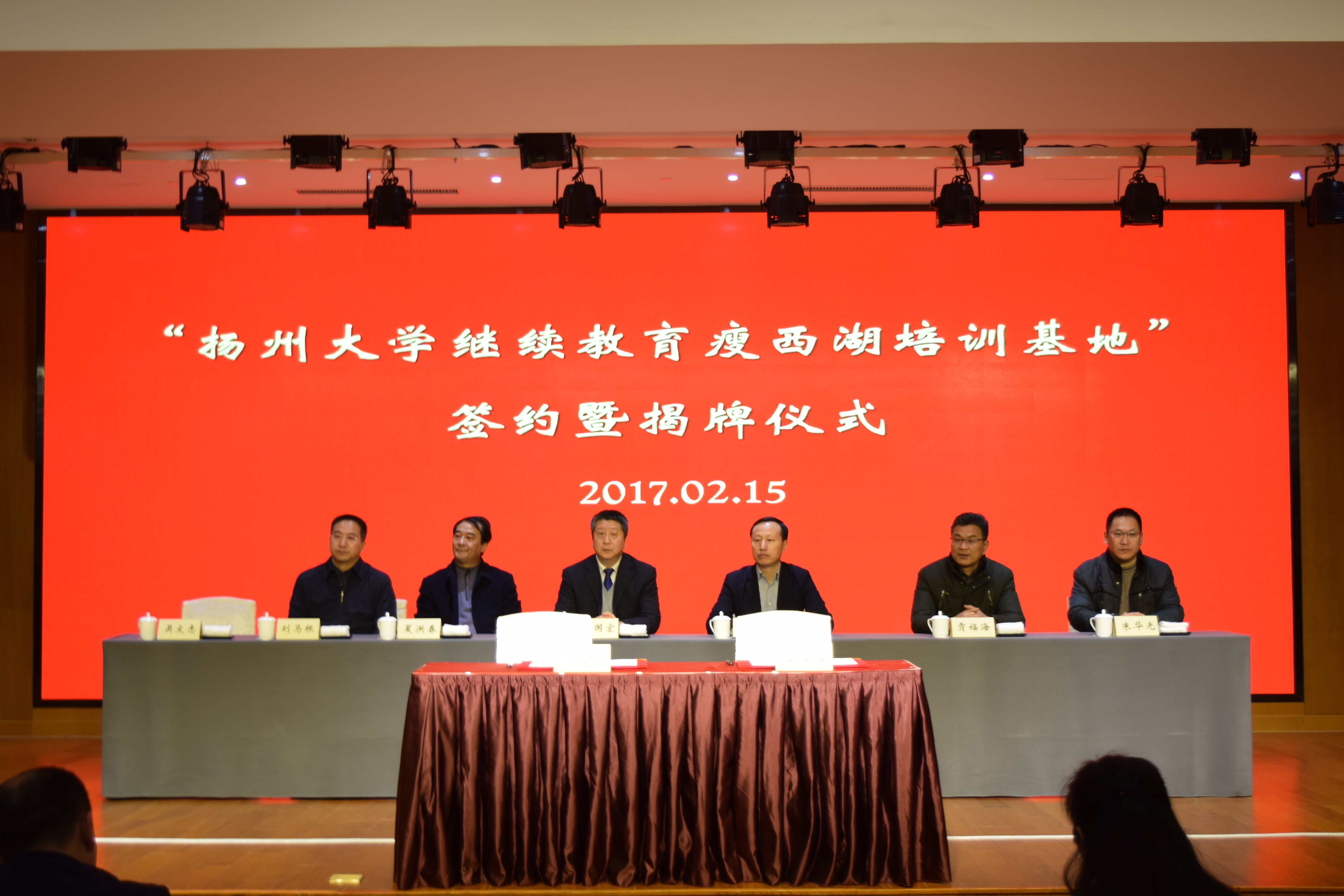 2017年2月15日上午,扬州大学继续教育瘦西湖培训基地签约暨揭牌仪式在瘦西湖温泉度假村重华堂成功举行。副校长陈国宏、蜀冈-瘦西湖风景名胜区管委会党工委书记张福堂出席签约并亲自为“扬州大学继续教育瘦西湖培训基地”揭牌。