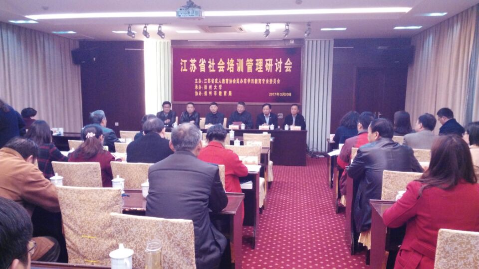 3月30日,2017年江苏省社会培训管理研讨会在我校瘦西湖校区虹桥专家楼召开。扬州大学陈国宏副校长出席会议并致辞,江苏省成人教育协会会长孙曙平出席会议。省教育厅社会教育处、省成人教育协会有关领导,民办非学历教育专业委员会委员,以及扬州市社会培训机构的部分负责人代表近90人参加了会议。