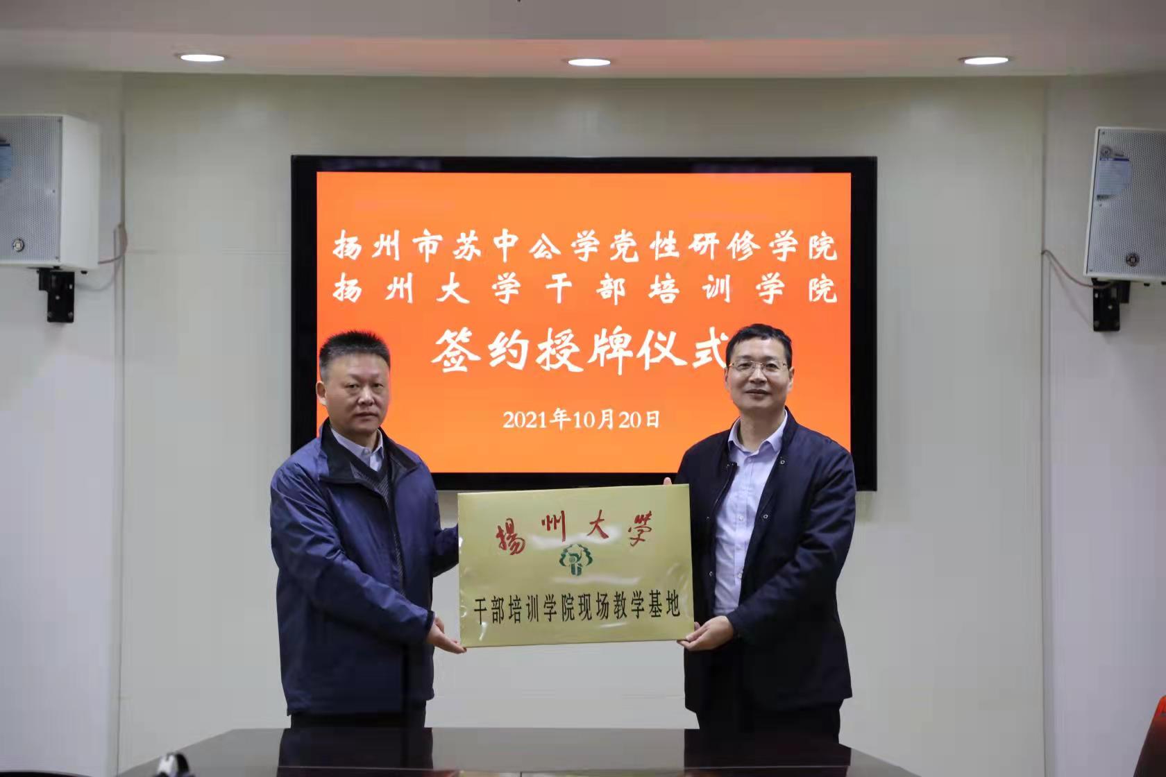10月20日,为进一步发掘校地优质资源,推进培训基地拓展工作,增强社会服务能力,提升培训品牌效应,扬州大学干部培训学院与扬州市苏中公学党性研修学院签约设立了“苏中公学干部培训现场教学基地”。我校继续教育学院、干部培训学院院长周斌和宝应县委组织部常务副部长朱士礼共同为“苏中公学干部培训现场教学基地”揭牌。