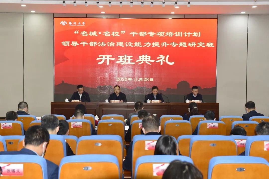 11月28日,由扬州大学和扬州市委组织部、市委依法治市办公室联合举办扬州市“名城•名校”干部专项培训计划“领导干部法治建设能力提升专题研究班”开班。扬州大学党委常委、副校长韩杰出席开班仪式并致辞,扬州市委组织部常务副部长、二级巡视员徐龙出席开班仪式并讲话,市委依法治市办副主任、市司法局局长姚爱国、继续教育学院院长周斌出席开班仪式。