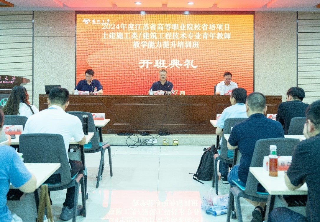 7月16日8点30分,2024年江苏省高等职业院校省培项目土建施工类/建筑工程技术专业青年教师教学能力提升培训班开班典礼在扬州大学瘦西湖校区新教学楼S-205报告厅顺利召开。开班典礼由扬州大学建筑科学与工程学院副院长邓社军主持,扬州大学继续教育处(学院)周斌处(院)长、扬州大学建筑科学与工程学院党委书记王恩军出席并分别代表扬州大学、建筑科学与工程学院致欢迎辞。